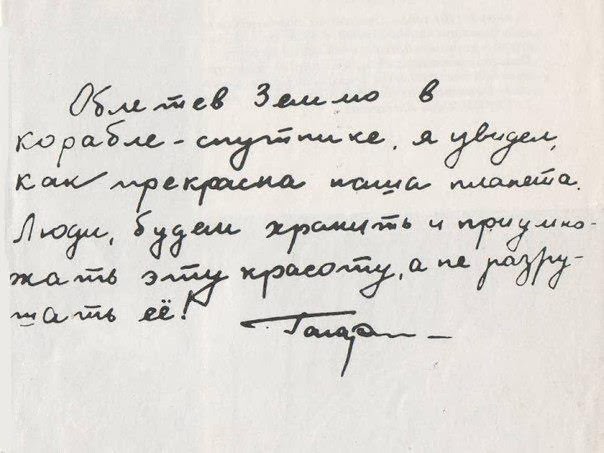 "Облетев Землю в корабле-спутнике, я увидел, как прекрасна наша планета. Люди, будем хранить и приумножать эту красоту, а не разрушать ее"