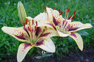 пурпурными мазками и пятнышками у основания долей. Высота растений 90-100 см . Цветет, начиная с